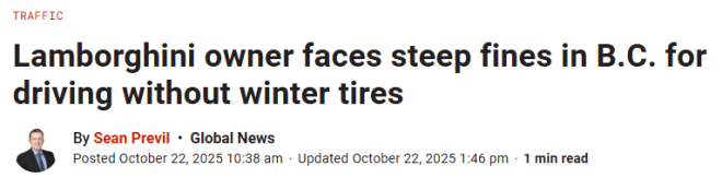 随着气温下降,卑诗省高速公路巡逻队提醒各位司机,在大多数省级高速公路上,车辆必须安装冬季轮胎(也称“雪胎”)并遵守限速——上周一位兰博基尼(Lamborghini)车主就亲身体验了后果。