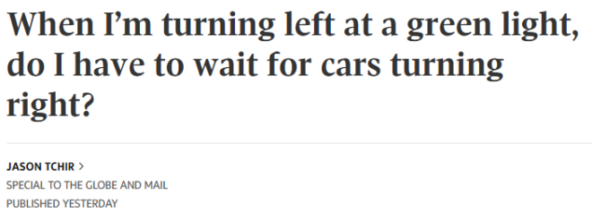 如果你左转时没有礼让正在右转、并进入同一车道的车辆,可能会被指控“危险转弯”,罚款85加元(若在社区安全区,罚款则为150加元),外加扣2分。