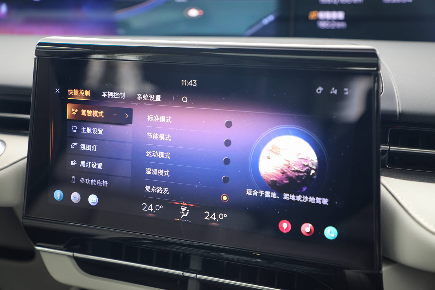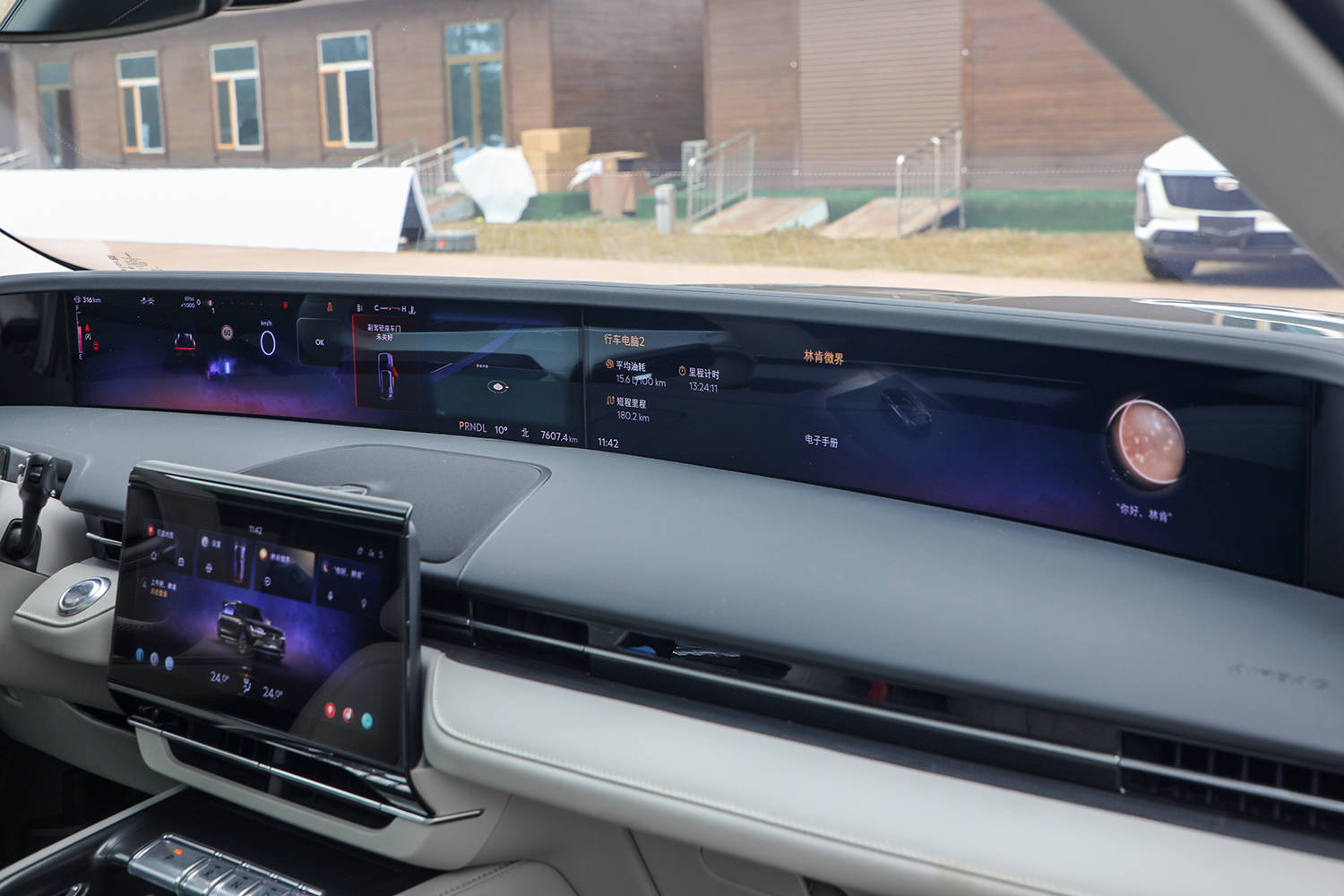 新车配备双23.6英寸环抱式屏堪称内饰的 点睛之笔,4K分辨率让显示效果细腻通透,仪表盘、中控主屏与副驾娱乐屏无缝衔接。下方11.1英寸悬浮式中控屏操作流畅,保留的实体快捷按键与电子按键排挡设计,兼顾了科技感与操作便利性,盲操作也能轻松上手。