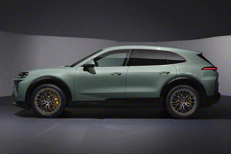 车身侧面来看,新车整体造型维持住了较为标准的SUV车身结构,同时新车前后侧翼子板上搭配了黑色轮眉,并搭配22英寸密条辐轮圈以及碳陶制动系统。新车还采用了传统的车门把手设计,并搭配宽厚的侧裙线条和车门筋线,整体设计让新车看上去更加动感。车身尺寸方面,新车长宽高分别为4985/1980/1674毫米,轴距为3023毫米,相比现款燃油版车型增加了130毫米。