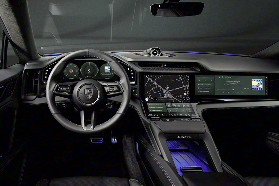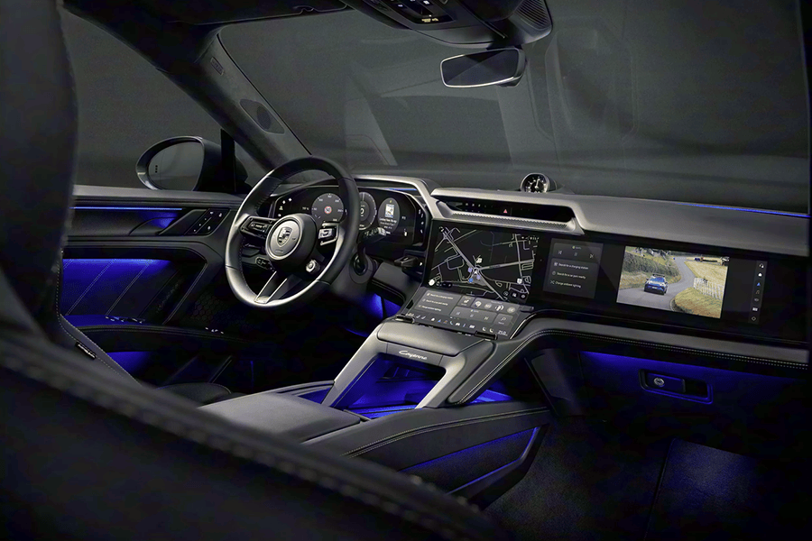 内饰方面,新车配备了14.25英寸OLED全数字仪表盘以及带有驾驶模式选择按键的三辐式多功能运动方向盘,并可选配87英寸的增强现实(AR)抬头显示系统;中控台配备了官方名为“Flow Display”流动显示屏的12.25英寸触控屏幕,该屏幕将拥有一定的弯折角度;此外,新车还可以选装14.9英寸的副驾娱乐屏,整体布局构成了全新研发的保时捷驾驶体验系统(Porsche Driver Experience)。