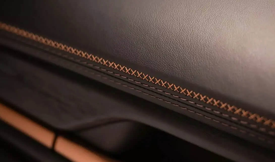 细节上,该车安全带、缝线采用日落红和巴瑞克红的配色。