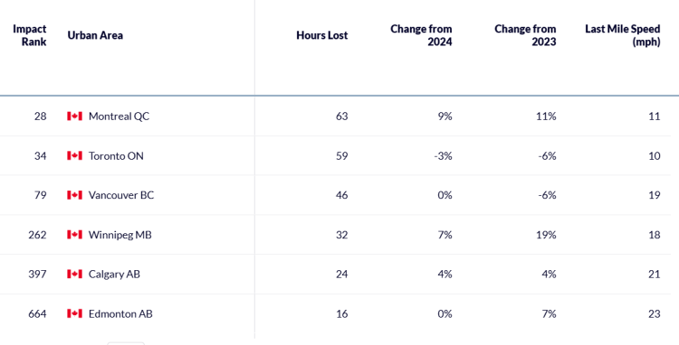 加拿大有三个城市跻身全球最塞车城市的前100名。