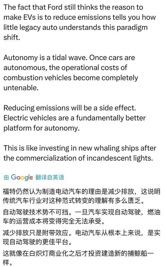一位网友写道:“福特仍然认为生产电动汽车的原因是为了减少排放,这一事实告诉你,传统汽车对这种模式转变的理解是多么的少。自主是一股浪潮。一旦汽车实现自主化,燃油汽车的运营成本将完全无法维持。减少排放只是一个副作用。电动汽车从根本上来说是一个更好的自动驾驶平台。这就像在白炽灯商业化之后投资新的捕鲸船一样。”