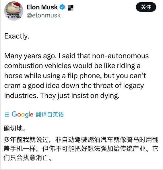 马斯克对此回应:“完全正确。多年前,我就说过,非自主内燃机汽车就像一边骑马一边使用翻盖手机,但你不可能把一个好主意硬塞给传统行业。他们只会执意消亡。”