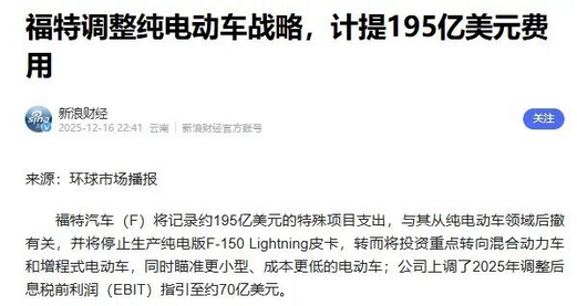 福特宣布,此次战略调整将计入高达195亿美元的特殊项目支出,这笔巨额损失,成为它转向必须付出的“学费”。