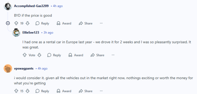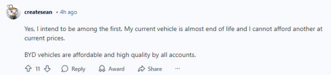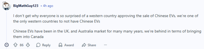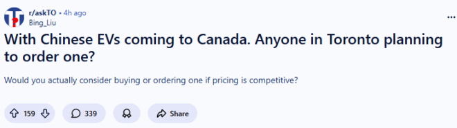在Reddit论坛的多伦多板块(r/askTO),这个问题吸引了不少网友前来讨论——随着中国电动车进入加拿大市场,有人打算订购一辆么?