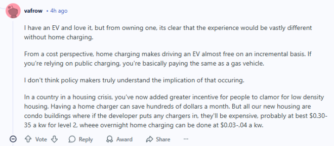 在一个本来就有住房危机的国家,你等于又给了大家一个去抢低密度住房的理由。有家用充电桩,每个月能省好几百块钱。可问题是,我们新建的房子几乎全是公寓,就算开发商装了充电桩,价格也不便宜——二级慢充大概 $0.30–0.35/度电;而在家夜间充电,只要 $0.03–0.04/度电。