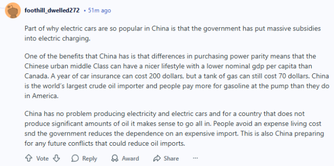中国不缺电,也能自己生产电动车。对于一个几乎不产油的国家来说,全力发展电动车本来就很合理——老百姓省生活成本,政府也能减少对昂贵能源进口的依赖。同时,这也是中国在为未来可能影响石油进口的冲突做准备。