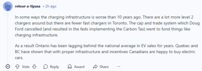 从某些角度看,现在的充电环境甚至比10年前还差。虽然二级慢充桩多了不少,但多伦多的快充反而变少了。之前道格·福特政府取消的限额与交易(cap-and-trade)体系,本来就是用来资助包括充电基础设施在内的项目,结果取消后,联邦政府才引入了碳税。