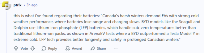 “加拿大冬天特别严酷,对电动车的低温性能要求很高——电池续航会下降,充电速度也会变慢。像比亚迪的海鸥(Seagull)和海豚(Dolphin)这样的车型,采用磷酸铁锂(LFP)电池,在零下低温环境下表现比传统锂离子电池更好。ArenaEV的测试也显示,在极端寒冷条件下,比亚迪的表现甚至优于特斯拉Model Y。LFP技术在漫长的加拿大冬天里,提供了更好的寿命和安全性。”