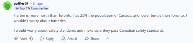 中国的哈尔滨比多伦多更靠北,人口只有加拿大的四分之一,气温也比多伦多低。所以电池问题我倒不担心。我倒是会担心安全标准,确保它们符合加拿大安全标准。