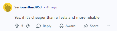 除了讨论,还一些网友直接表示要考虑中国电动车,比如比亚迪;只要比特斯拉便宜,更可靠就行;家里的车快不行了,根本买不起现在的油车,BYD的价格和质量真的行!
