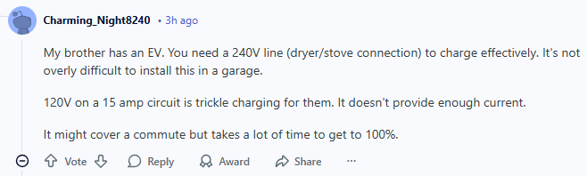 我弟弟也有一辆电动车。真正高效充电,还是得上240V线路(像烘干机或炉灶那种接口)。在车库里装这个,其实并不算太难。