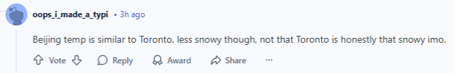 北京的气温和多伦多差不多。不过北京雪少一些,说实话,我觉得多伦多的雪也不算多。