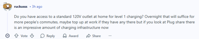 你家里有没有普通的120V插座,用来做一级充电?一晚上充下来,其实就能覆盖大多数人的通勤需求,要是单位还能顺便充一下就更好了。而且如果你看看 PlugShare,会发现现在的充电设施数量其实已经挺可观了。