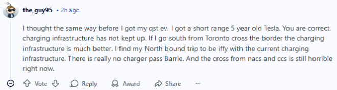 我在买 QST 电动车之前想法跟你一模一样。我买的是一辆续航较短、5年车龄的特斯拉。你说得没错,充电基础设施确实没跟上。如果从多伦多往南、过了边境,美国那边的充电条件要好得多;但往北走就比较悬了。现在的充电网络下,Barrie 以北几乎没什么充电桩,而且 NACS 和 CCS 接口之间的兼容问题,目前也还是一团糟。