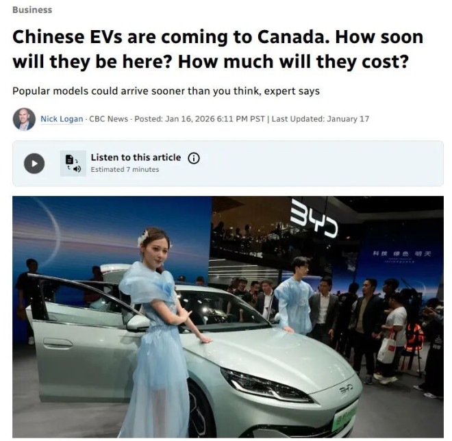加拿大总理马克·卡尼(Mark Carney)日前宣布,加拿大将重新向中国制造的电动车“开门”。