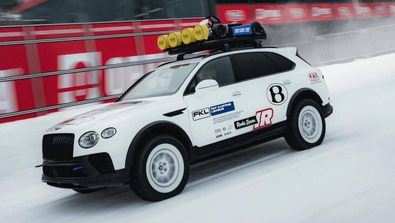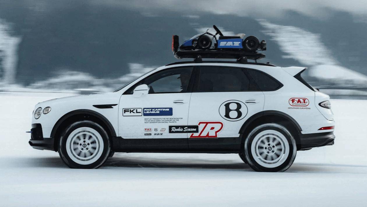 外观上,宾利还增加了车顶储物舱,内含一辆电动卡丁车,并配有四盏超大探照灯、双拖车钩,采用高山白涂装与白色轮圈,整体更有探险装备感。