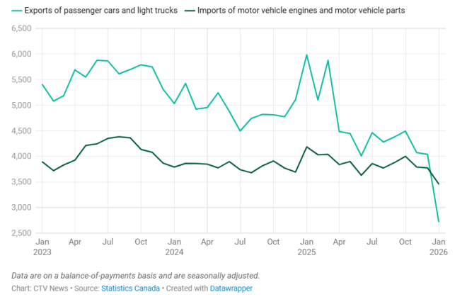这一数据来自加拿大统计局周四发布的1月份商品贸易数据。报告指出,乘用车和轻型卡车出口降幅最大,下降了32.5%。
