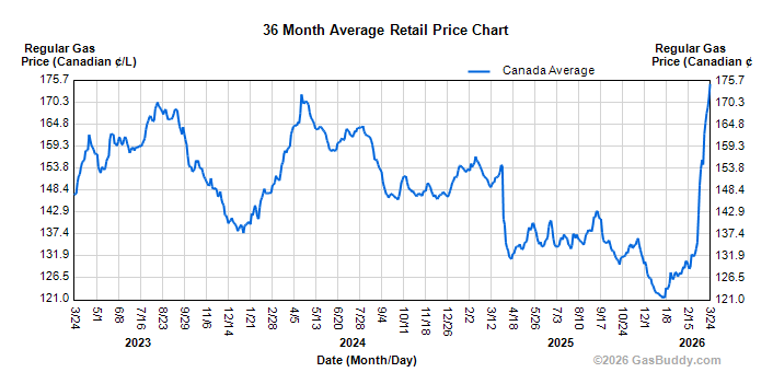 另外,根据GasBuddy过去36个月的零售油价走势图,加拿大最新平均油价升至每100公升$175.7.为2024年5月后的新高水平。在国际局势与供应风险交织下,本地油价短期内仍可能维持高位。