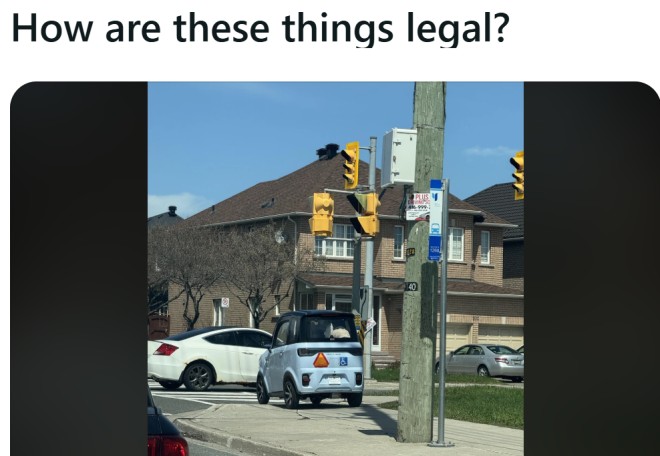 关于法规层面,不少网友指出,目前安省对于类似代步车的分类和监管相当模糊。有网友引用媒体报道称,这类封闭式车辆实际上属于"低速车(LSV)",其设计、大小和载客量已超出传统代步车范畴。根据目前规定,带有封闭车身、能搭载多人的微型电动车其实不应在人行道上行驶。