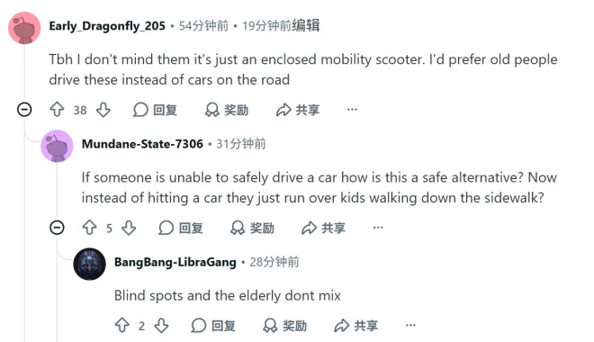 部分市民则强调,实际路面上这些代步车的驾驶者大多行为规范、速度缓慢,不会对行人构成威胁。有网友补充道:"我见过的司机都很有礼貌,速度也慢。"还有人认为,比起电动滑板车、单车高速横穿人行道,封闭代步车的风险并不更高。